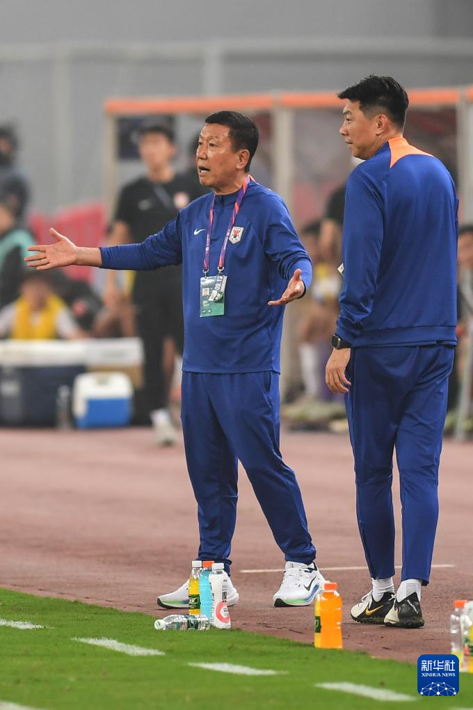 9月13日,山东泰山队主教练崔康熙(左)在比赛中指挥。