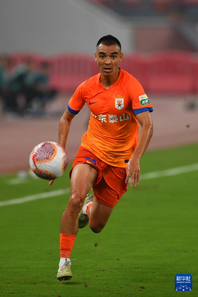 9月13日,山东泰山队球员刘彬彬在比赛中带球。
