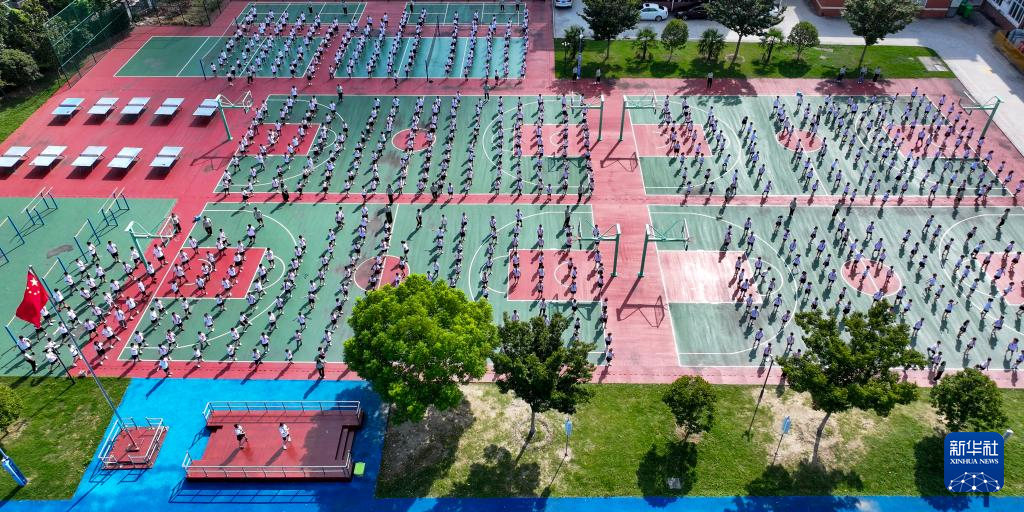 9月14日,学生在大课间做广播体操(无人机照片)。新华社发(王须中摄)