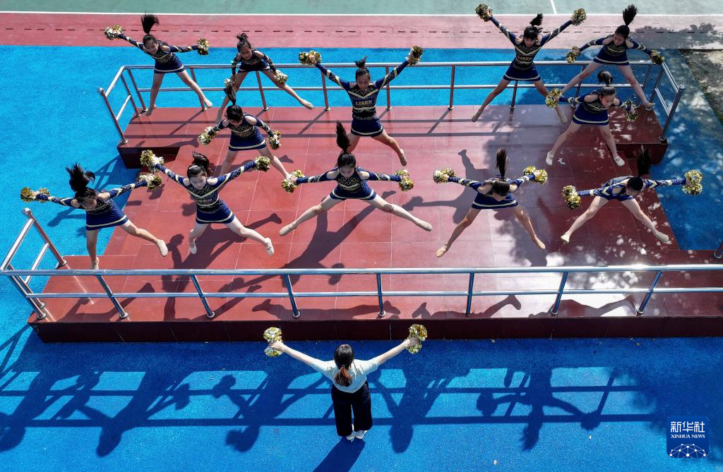 9月14日,学生在大课间跳健美操(无人机照片)。新华社发(王须中摄)