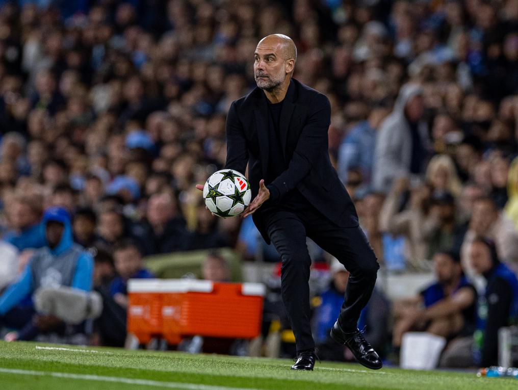 9月18日,曼彻斯特城队主帅瓜迪奥拉在场边捡球。新华社发