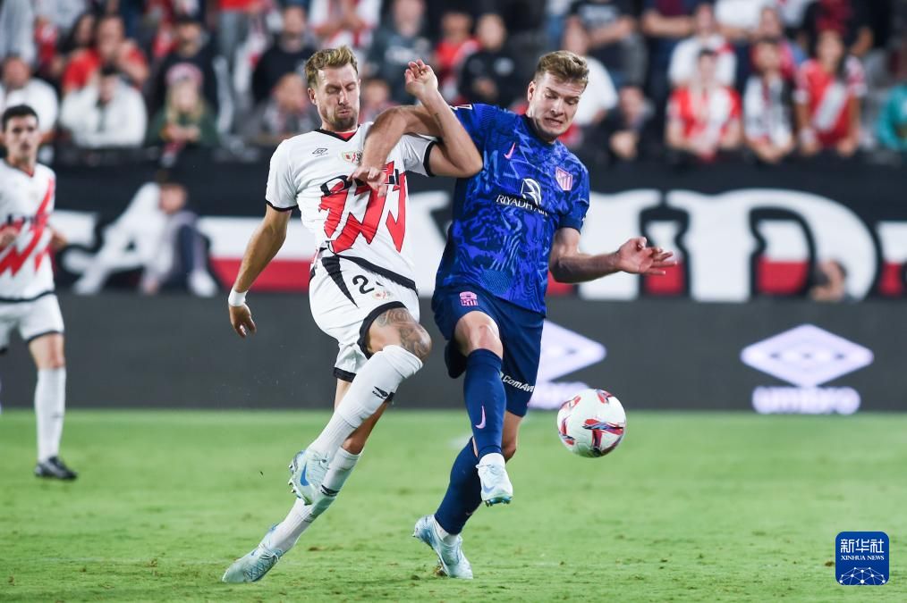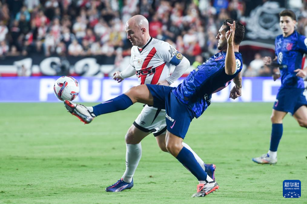 9月22日,马德里竞技队球员瑟洛特(右)与巴列卡诺队球员勒热纳在比赛中拼抢。