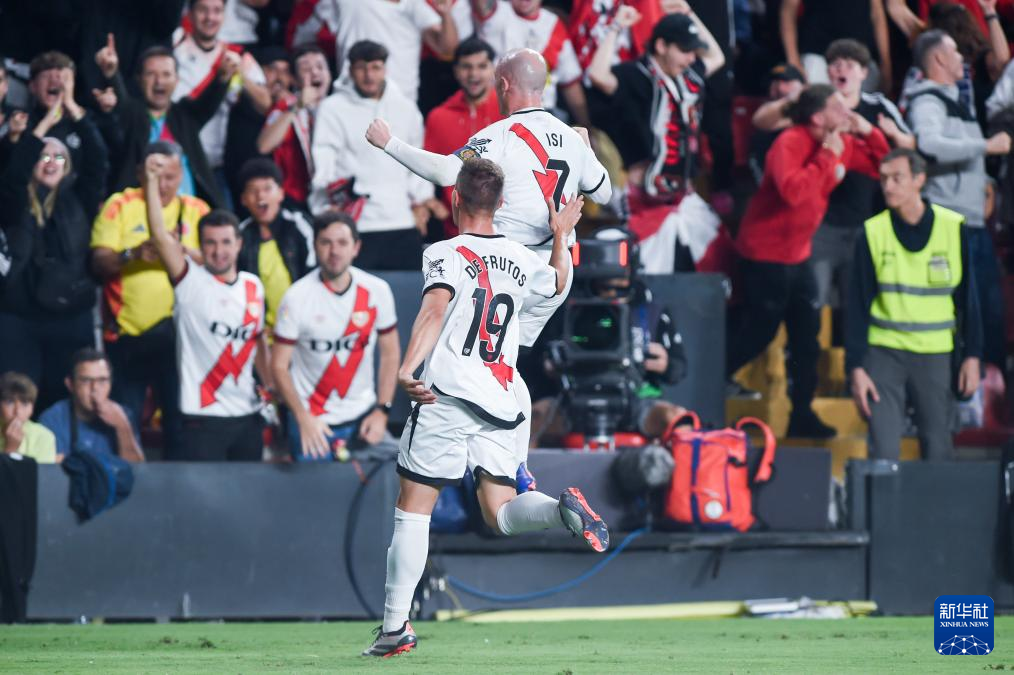 9月22日,巴列卡诺队球员帕拉松(前上)在比赛中进球后庆祝。