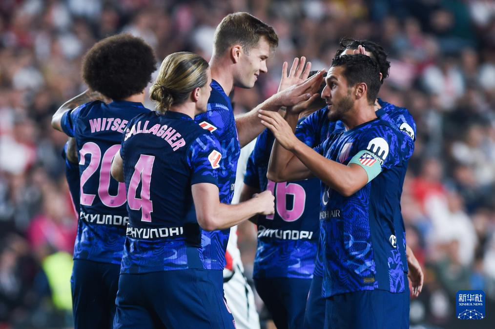 9月22日,马德里竞技队球员加拉格尔(右一)在比赛中进球后与队友庆祝。