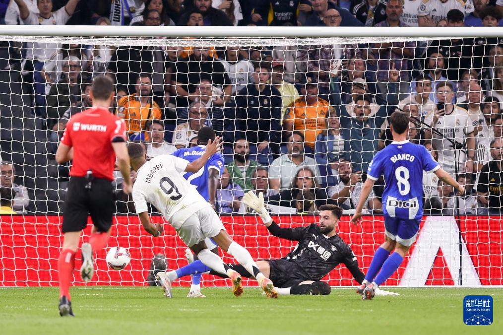 9月24日,皇家马德里球员姆巴佩(左二)在比赛中射门得分。