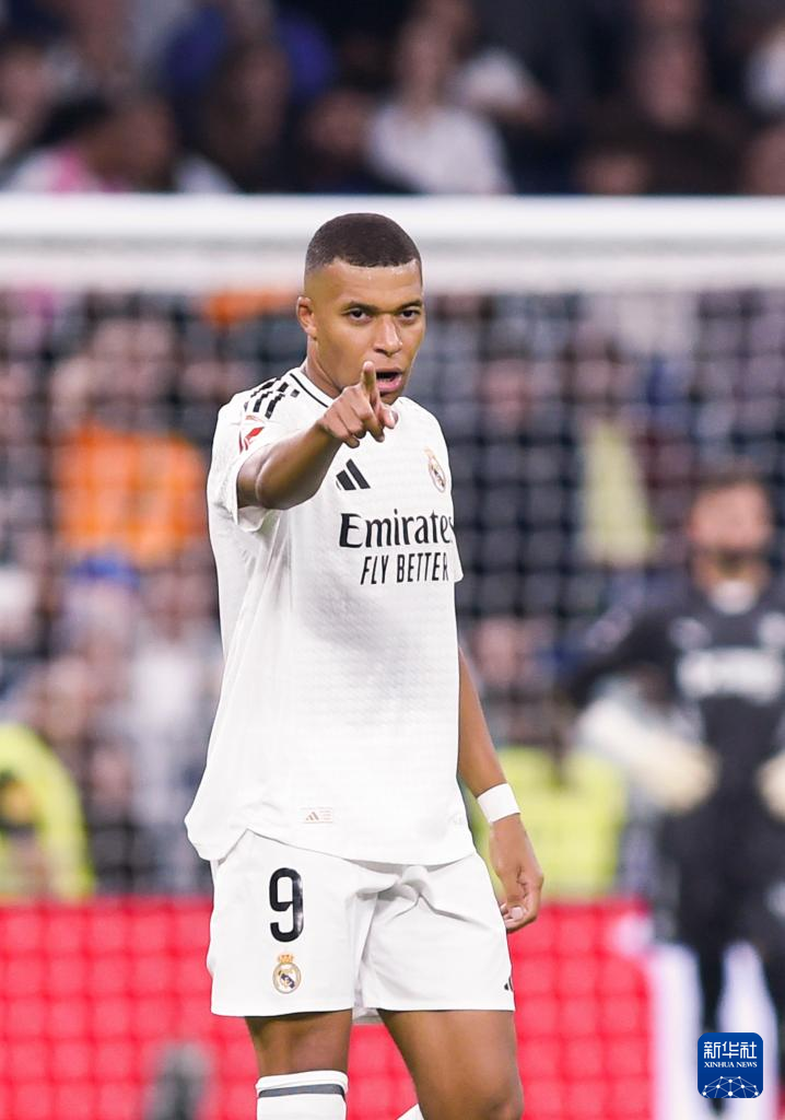 9月24日,皇家马德里球员姆巴佩在比赛中庆祝进球。