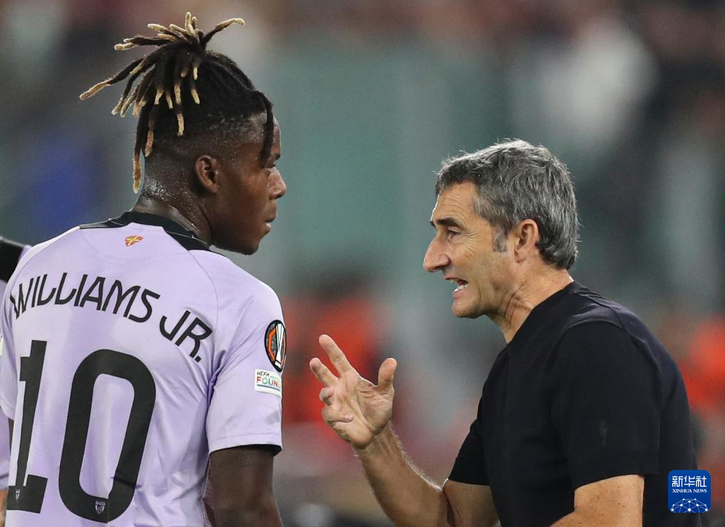 9月26日,毕尔巴鄂竞技队主教练巴尔韦德(右)在场边指导球员尼科·威廉姆斯。