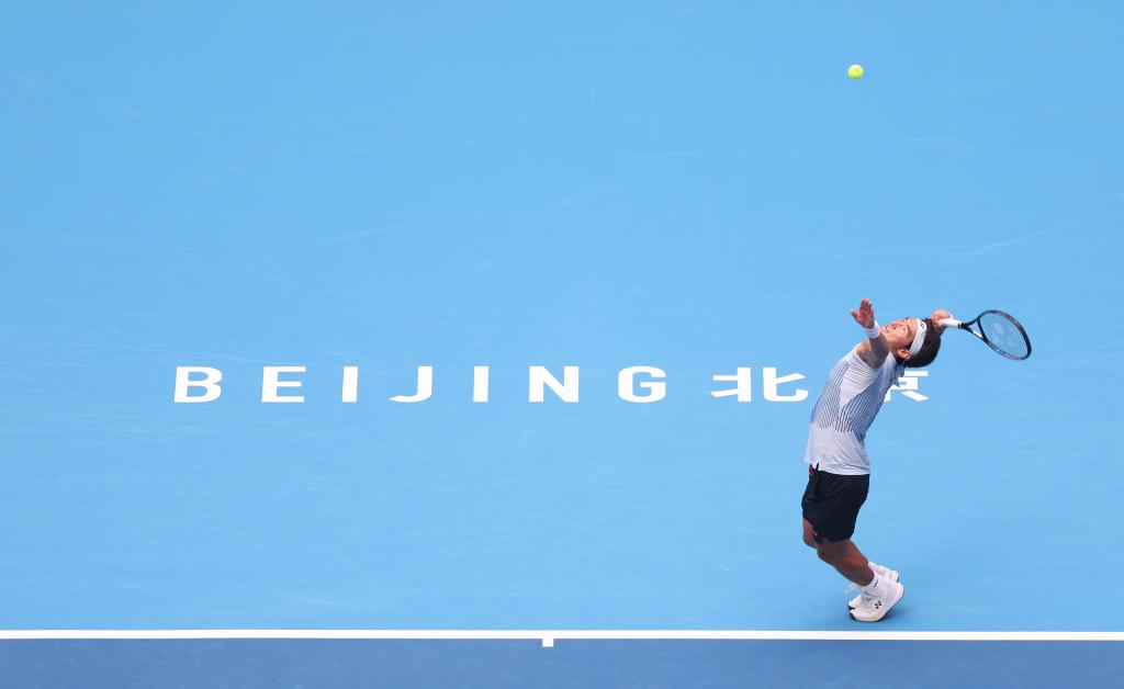 9月27日,布云朝克特在比赛中发球。当日,在北京进行的中国网球公开赛男单首轮比赛中,布云朝克特2:1战胜商竣程,晋级下一轮。新华社记者 白雪飞 摄