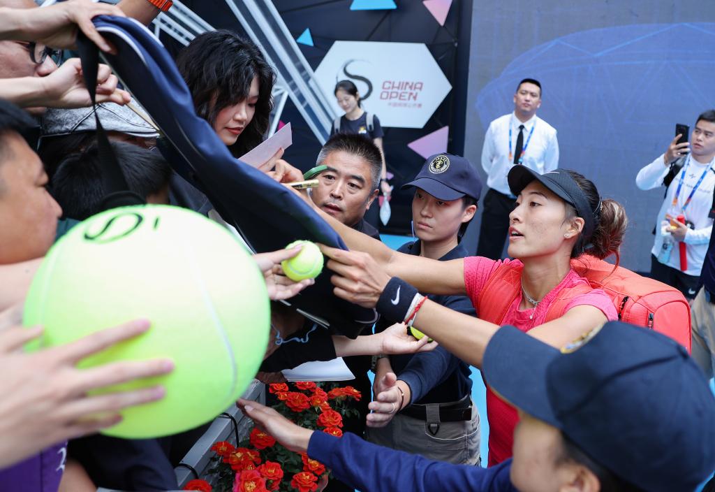 9月23日,郑钦文在训练结束后为球迷签名。新华社记者 白雪飞 摄
