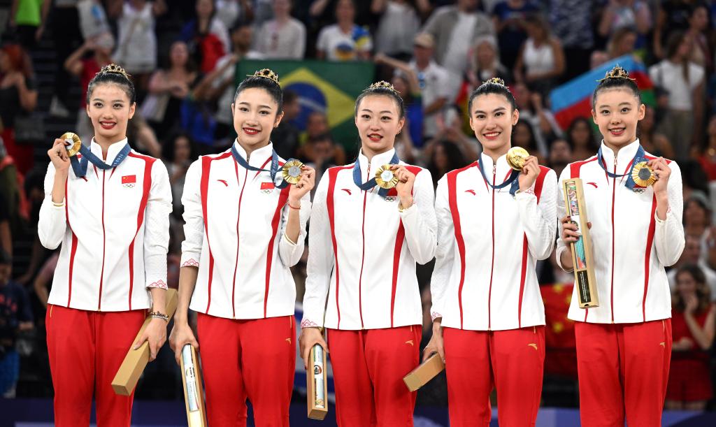 8月10日,中国队在颁奖仪式上。当日,在巴黎奥运会艺术体操项目集体全能决赛中,中国队获得冠军。新华社记者 程敏 摄