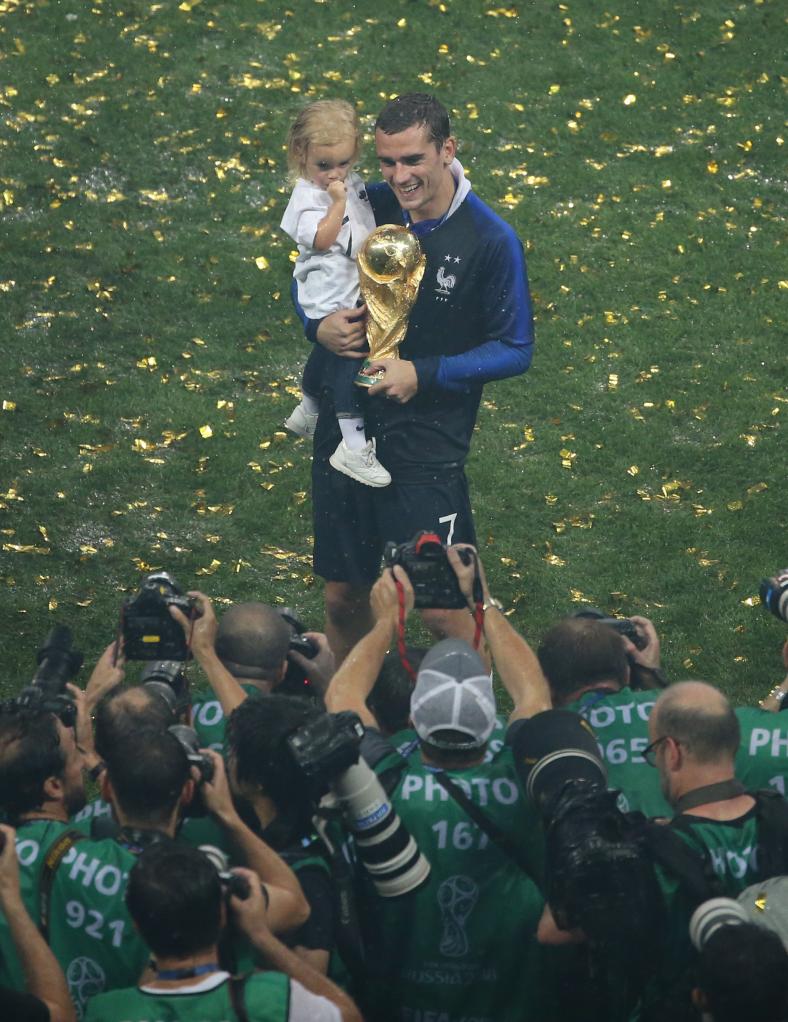 2018年7月15日,法国队球员格列兹曼怀抱女儿与大力神杯合影。当日,在莫斯科进行的世界杯足球赛决赛中,法国队以4:2战胜克罗地亚队,继1998年后再夺世界杯冠军。新华社记者 李明 摄