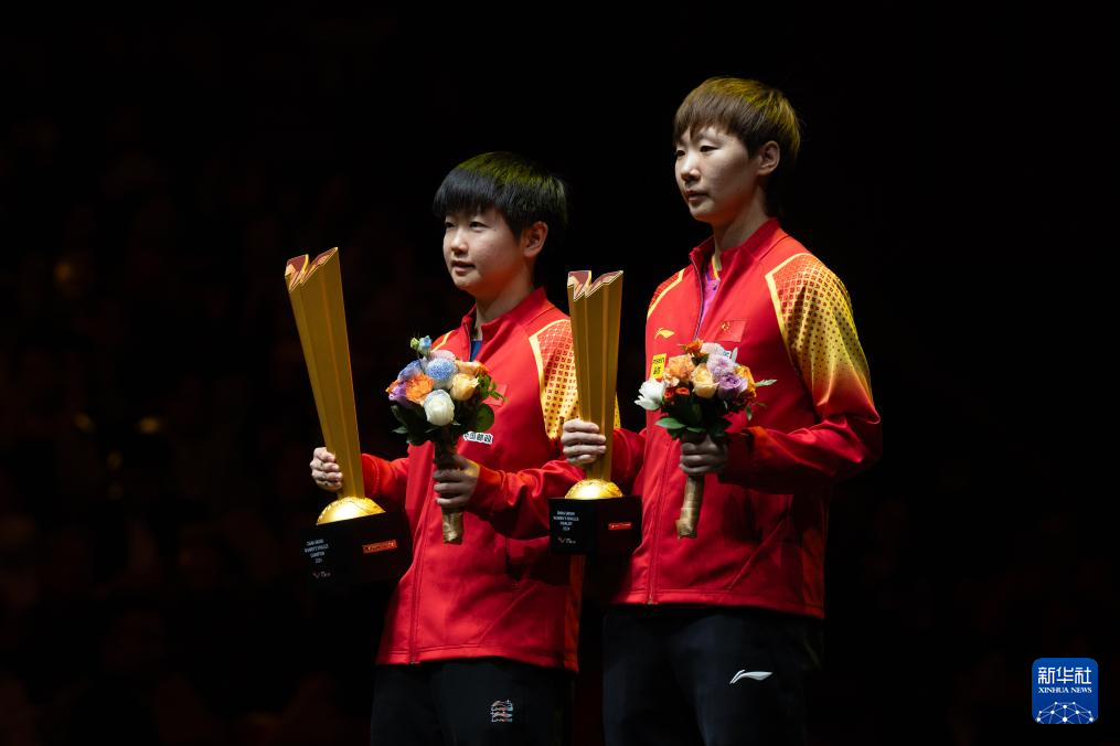 10月6日,孙颖莎(左)和王曼昱在颁奖仪式上。
