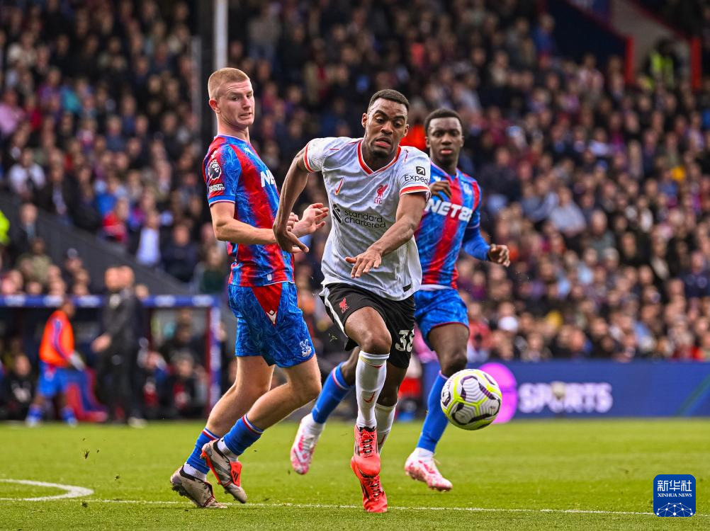10月5日,利物浦队球员赫拉芬贝赫(中)与水晶宫队球员拼抢。当日,在2024-2025赛季英格兰足球超级联赛第七轮比赛中,利物浦队客场1比0战胜水晶宫队。新华社发