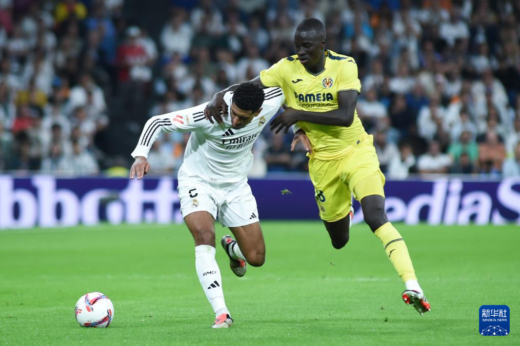 10月5日,皇家马德里队球员贝林厄姆(左)和比利亚雷亚尔队球员格耶在比赛中拼抢。