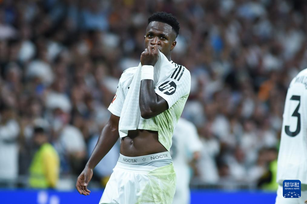 10月5日,皇家马德里队球员维尼修斯在比赛中庆祝进球。