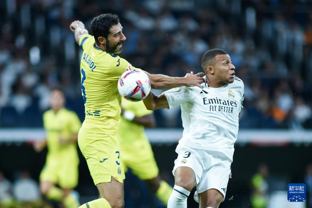 10月5日,皇家马德里队球员姆巴佩(右)和比利亚雷亚尔队球员阿尔比奥尔在比赛中拼抢。