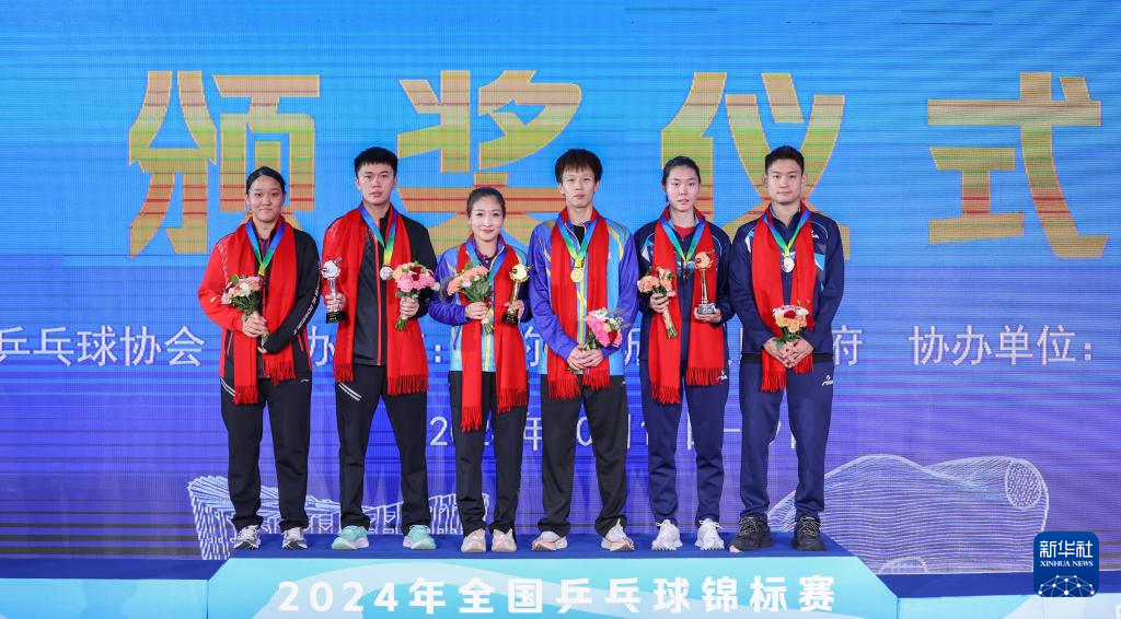 10月15日,冠军广东队组合林高远(右三)/刘诗雯(左三)、亚军上海地产集团队组合赵钊彦(左二)/孙铭阳(左一)、季军山东队组合刘丁硕/孙艺祯(右二)在颁奖仪式上。