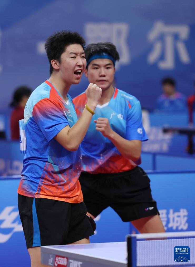 10月16日,广西银河队组合谢昀熹/赵骢越(左)在双打比赛中庆祝得分,他们不敌河南队组合温瑞博/夏易正。