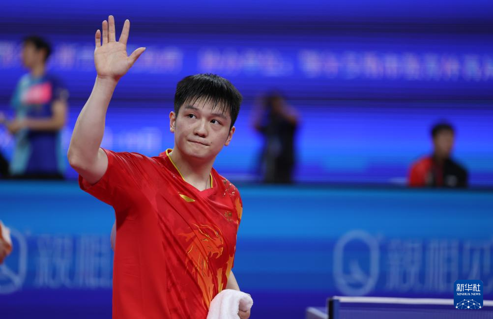 10月18日,上海地产集团队选手樊振东在单打比赛中3比0战胜青海米粒队选手罗铮后,向观众挥手致意。