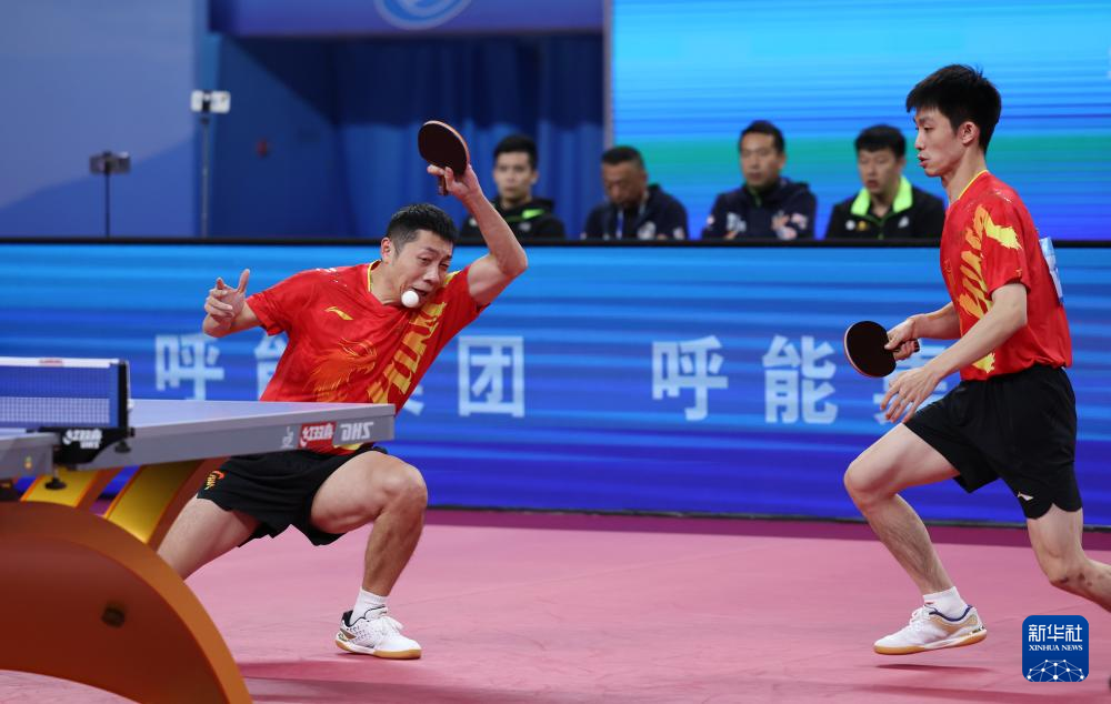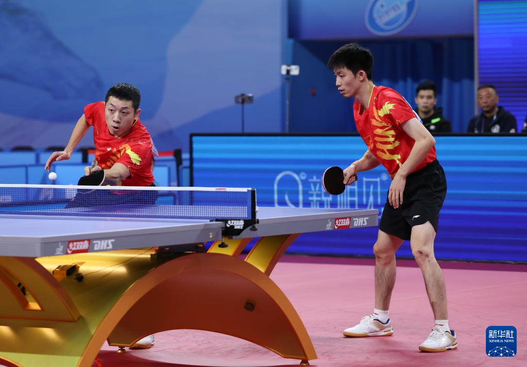 10月18日,上海地产集团队组合许昕(左)/周恺在双打比赛中。最终,他们3比0战胜青海米粒队组合陈磊欣/王麒凯。