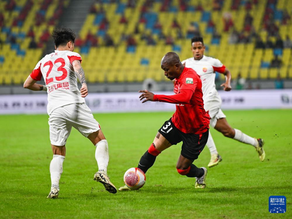 10月18日,成都蓉城队球员周定洋(左一)和上海海港队球员武磊(左二)在比赛中拼抢。