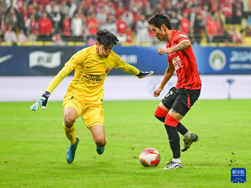 10月18日,成都蓉城队球员韦世豪(右)和上海海港队守门员颜骏凌拼抢。
