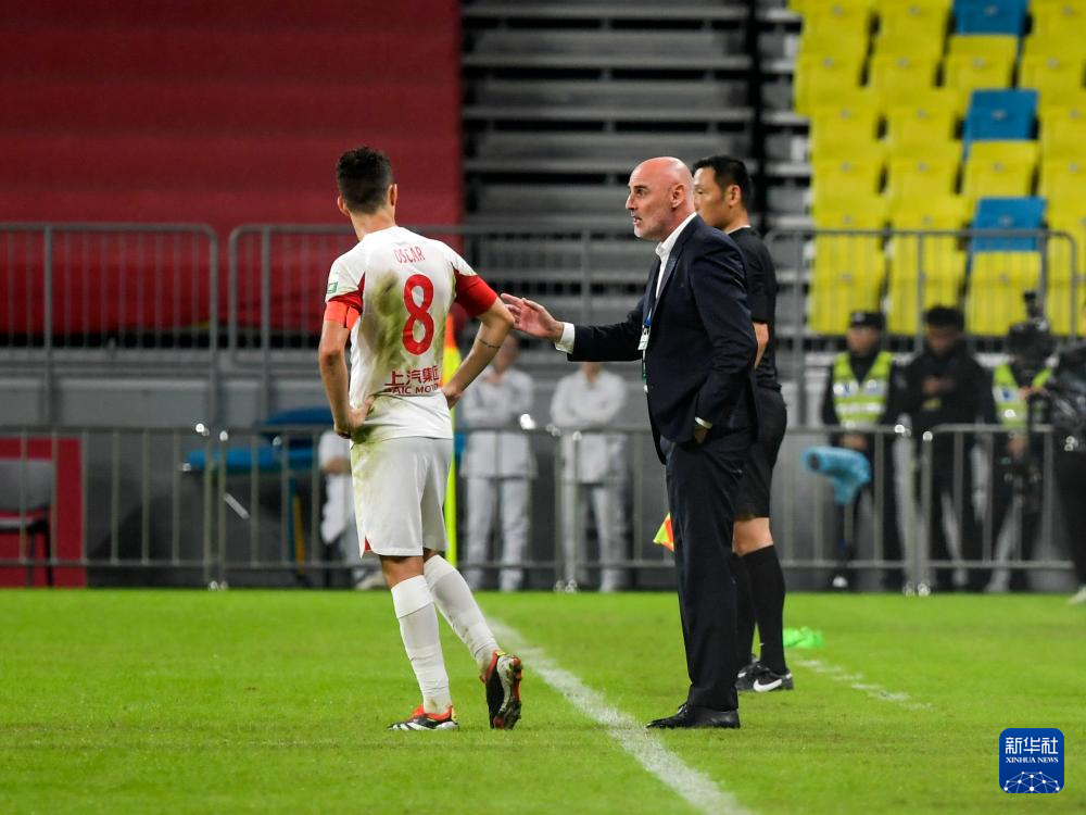 10月18日,上海海港队主教练穆斯卡特(中)和球员奥斯卡交流。