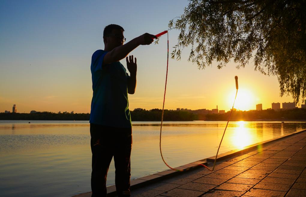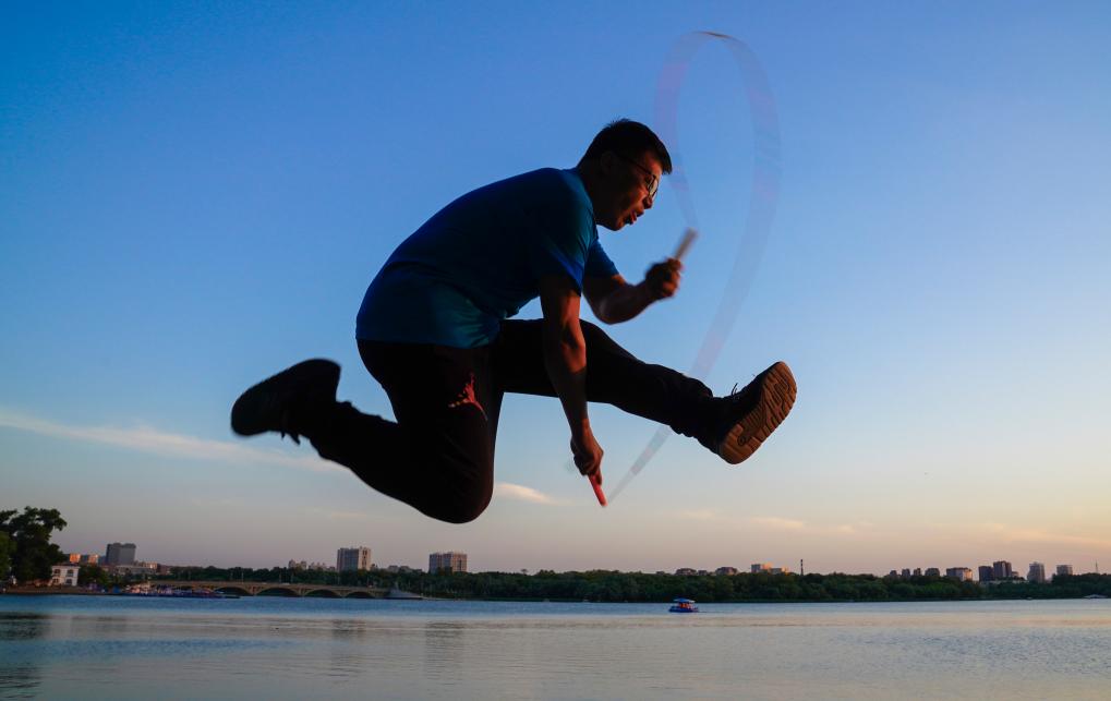图为于大伟在长春市南湖公园进行跳绳训练。