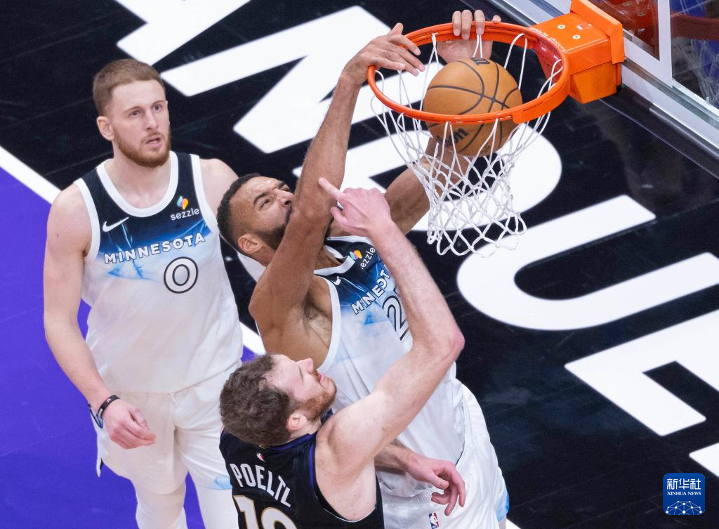 11月21日,森林狼队球员戈贝尔(中)在比赛中扣篮。