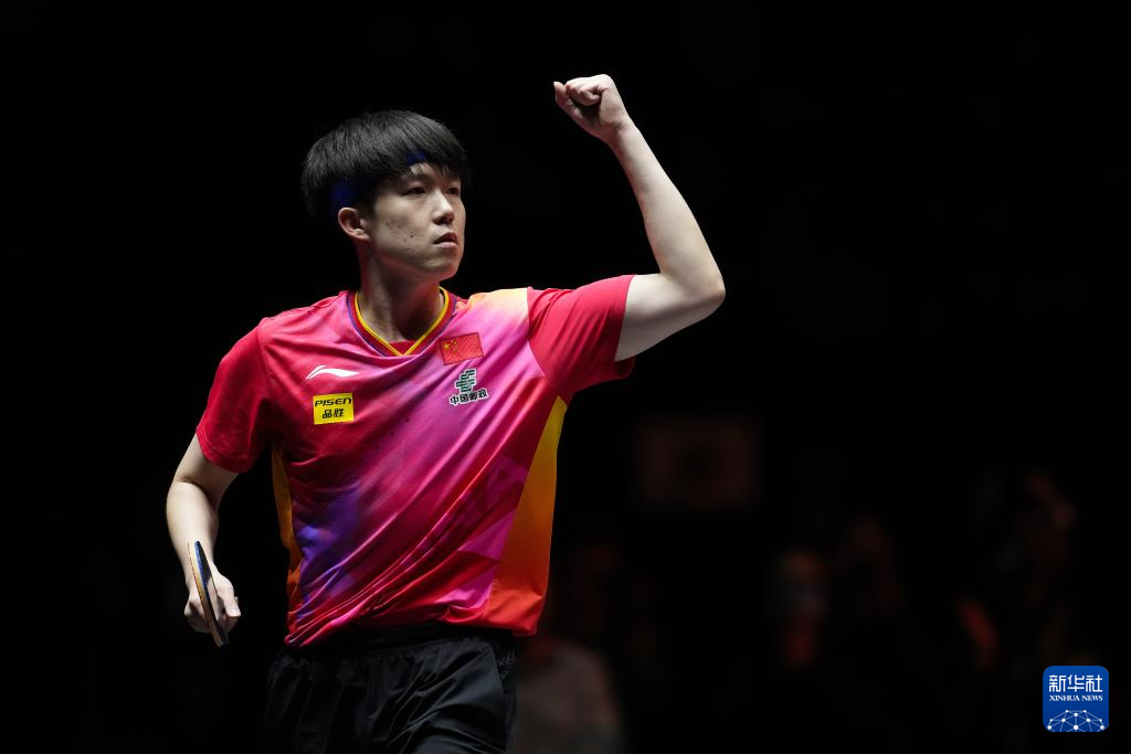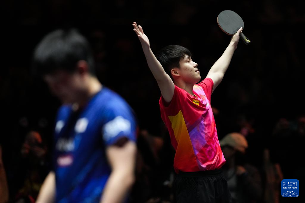 11月24日,中国选手王楚钦(左)在比赛后庆祝胜利。