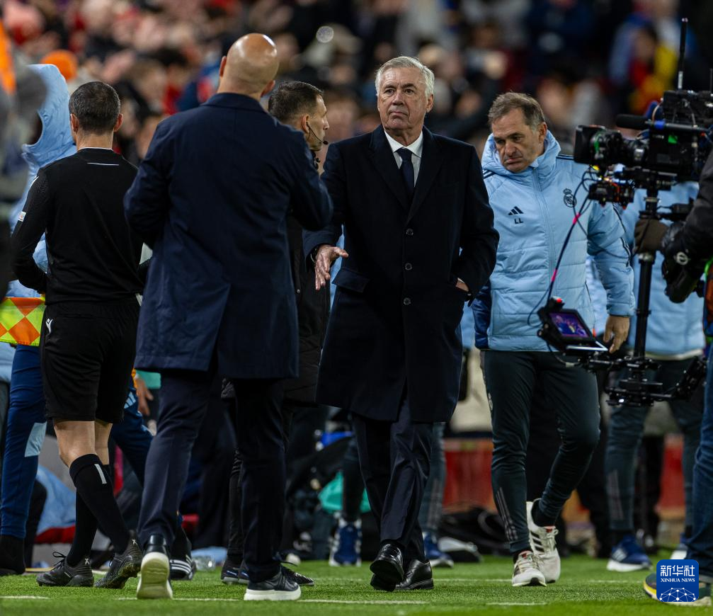 11月27日,皇家马德里队主教练安切洛蒂(前右)赛后与利物浦队主教练斯洛特(前左)握手致意。
