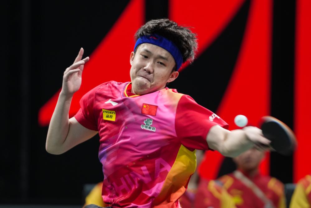 12月1日,中国队选手王楚钦在男单比赛中回球。新华社记者 江宏景 摄