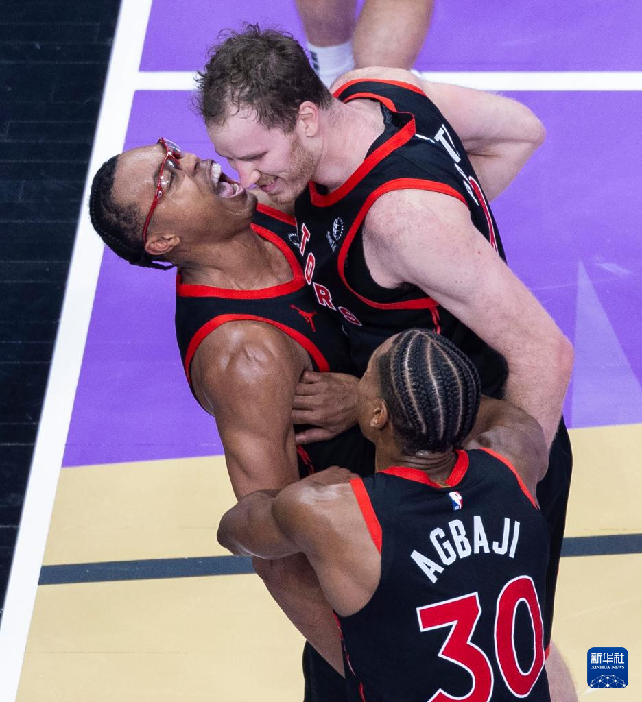 12月3日,猛龙队球员巴恩斯(上左)、珀尔特尔(上右)与阿巴吉在比赛中庆祝得分。