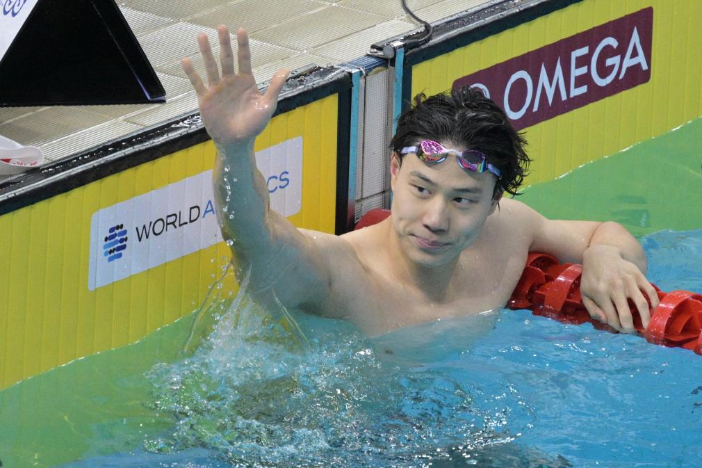 11月1日,2024世界泳联游泳世界杯新加坡站男子50米蛙泳决赛,中国选手覃海洋以25秒47的成绩夺得冠军。新华社发(邓智炜 摄)
