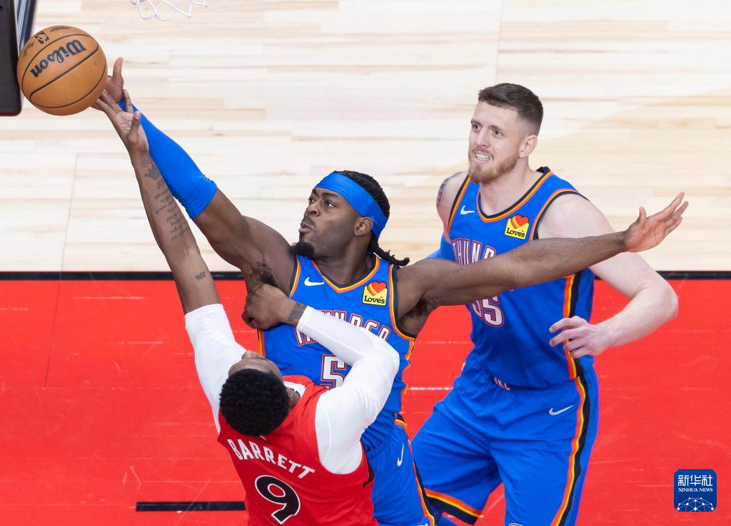 12月5日,雷霆队球员多尔特(中)在比赛中封盖猛龙队球员巴雷特(下)的上篮。