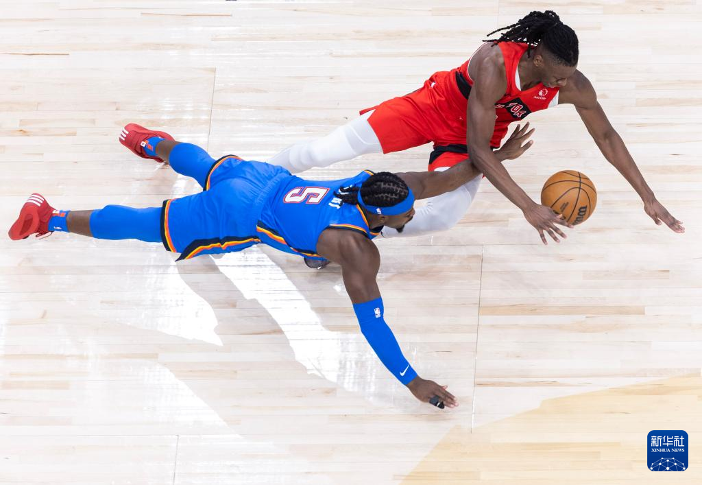 12月5日,雷霆队球员多尔特(下)与猛龙队球员莫格博在比赛中拼抢。