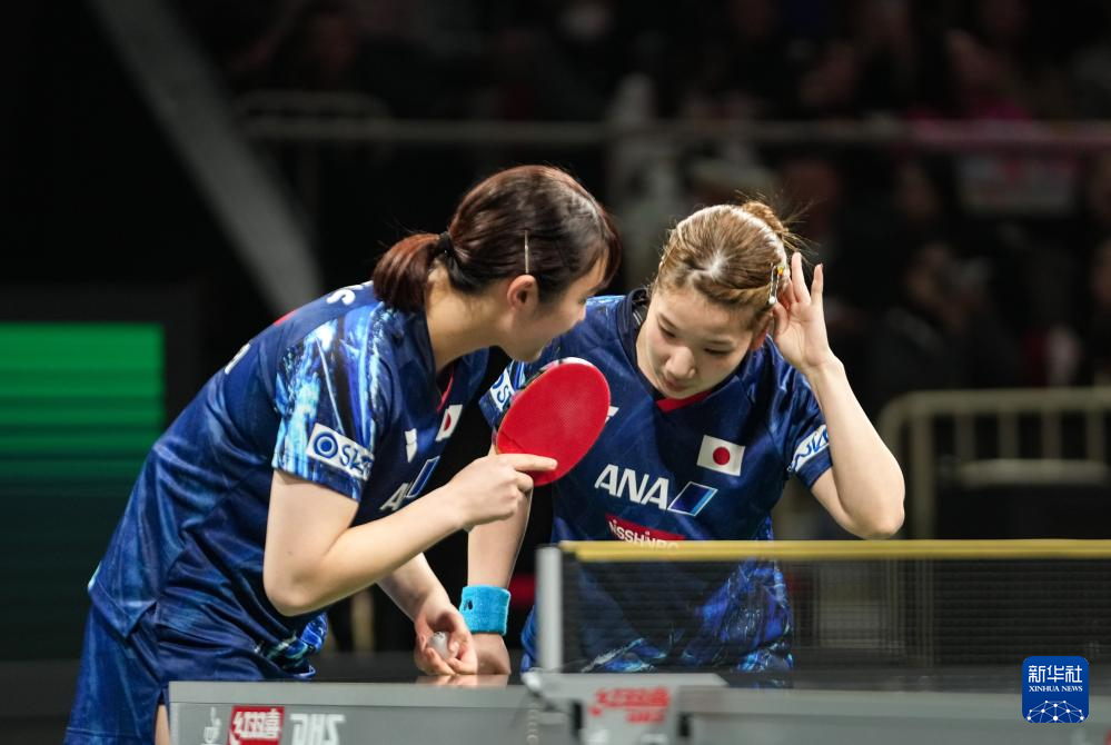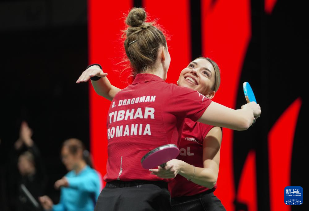 12月5日,罗马尼亚队组合德拉戈曼/斯佐科斯(右)在女双比赛中获胜后相拥庆祝。最终,她们1比0战胜日本队组合森樱守/笹尾明日香。