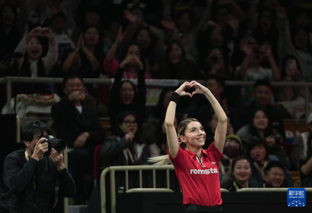 12月5日,罗马尼亚队选手斯佐科斯在女双比赛后向观众致意。最终,罗马尼亚队组合德拉戈曼/斯佐科斯1比0战胜日本队组合森樱守/笹尾明日香。