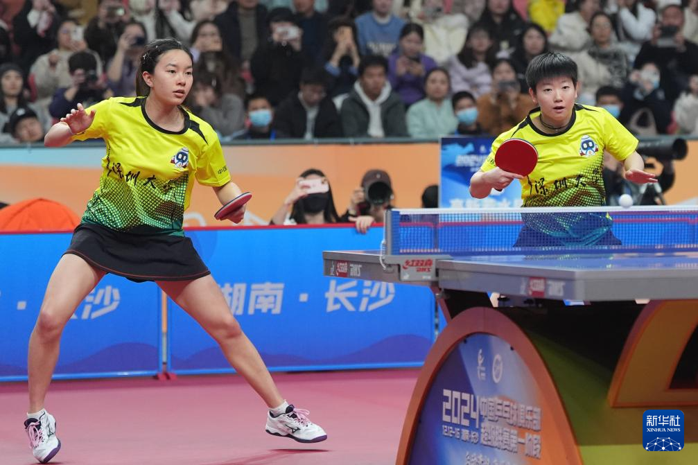 12月12日,深圳大学队组合孙颖莎(右)/吴咏琳在女子团体双打比赛中,她们3比0战胜成都高新若水居队组合杨玉鑫/冷雨桐。最终,深圳大学队3比0战胜成都高新若水居队。