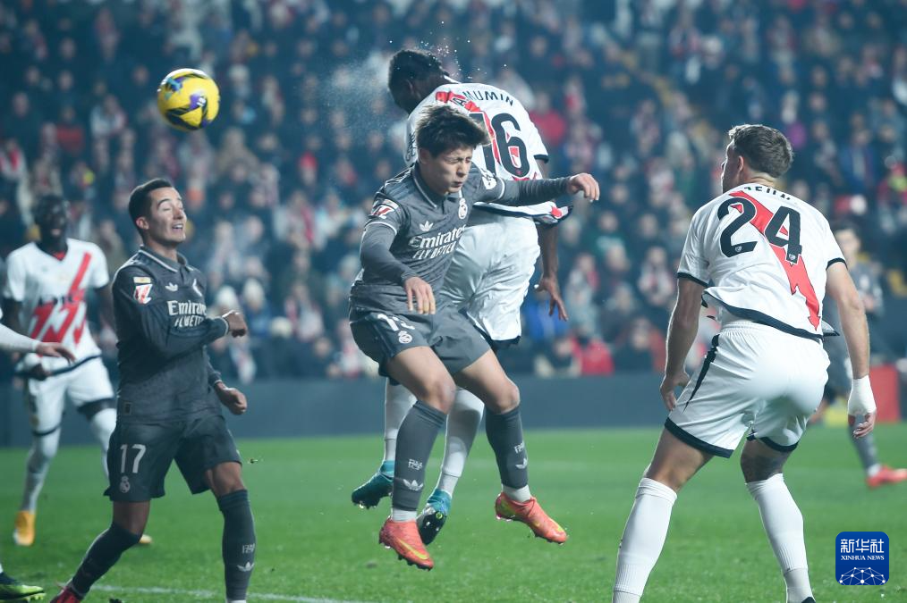 12月14日,巴列卡诺队球员穆敏(上)在比赛中头球破门。