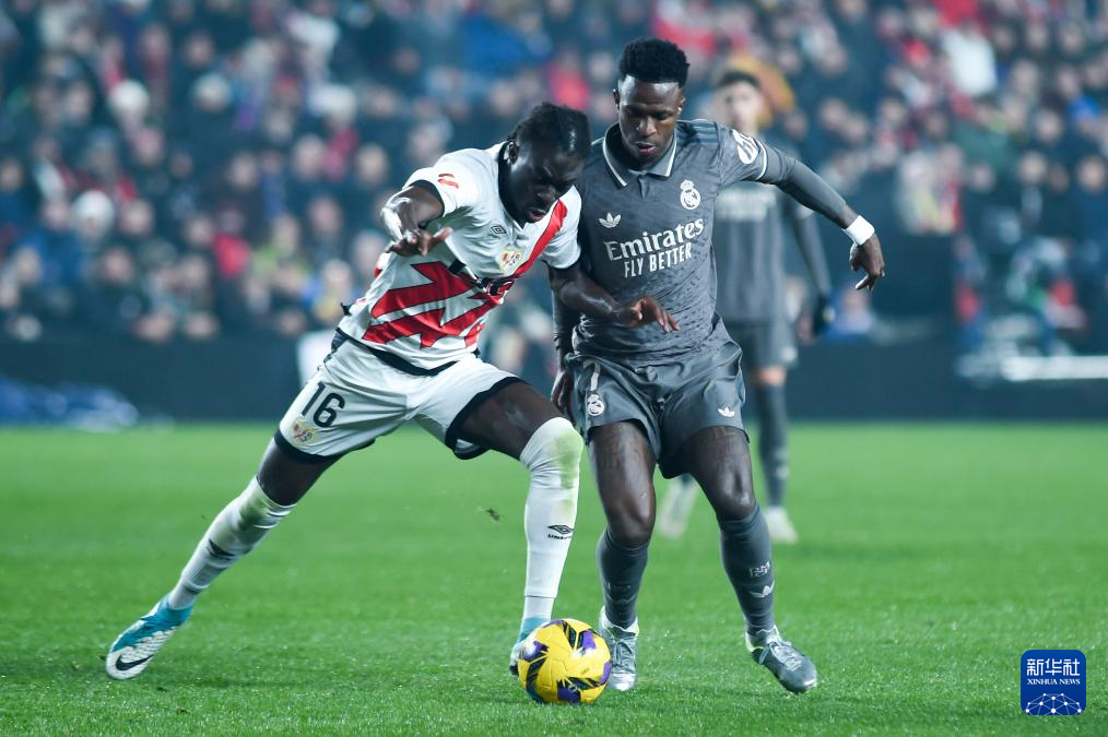 12月14日,皇家马德里队球员维尼修斯(右)与巴列卡诺队球员穆敏在比赛中拼抢。