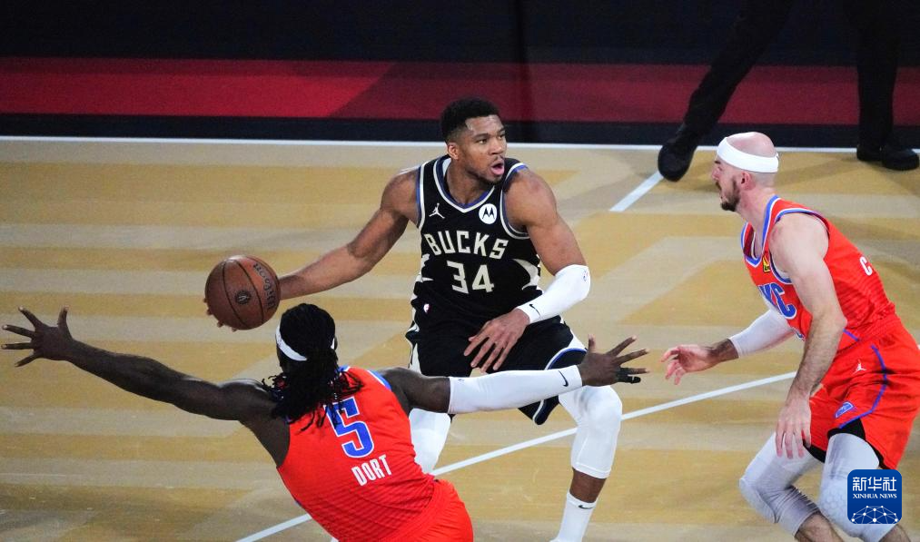 12月17日,雄鹿队球员安特托昆博(中)在比赛中传球。新华社记者 吴晓凌 摄