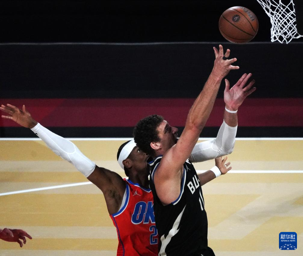 12月17日,雄鹿队球员布鲁克·洛佩兹(右)在比赛中上篮。新华社记者 吴晓凌 摄