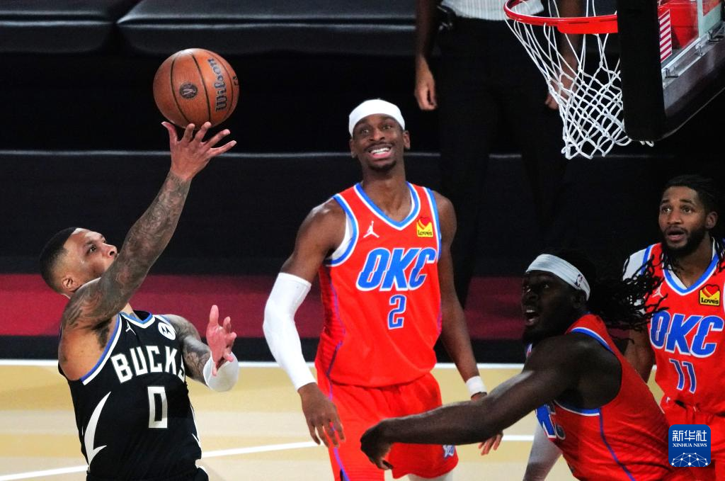 12月17日,雄鹿队球员利拉德(左一)在比赛中上篮。新华社记者 吴晓凌 摄