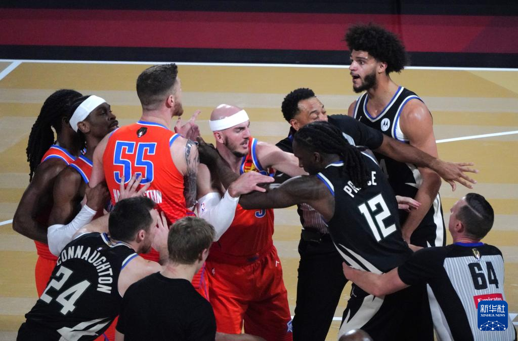 12月17日,雄鹿队球员与雷霆队球员发生冲突。新华社记者 吴晓凌 摄
