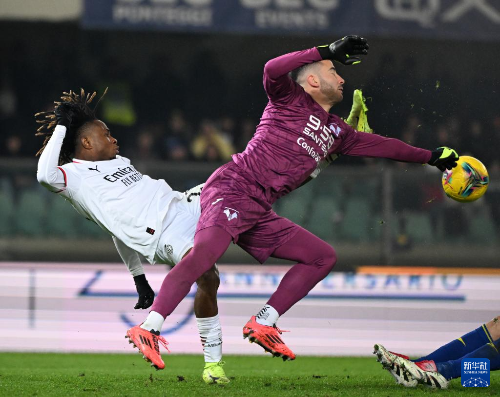 12月20日,AC米兰队球员楚克乌泽(左)与维罗纳队门将蒙迪普在比赛中拼抢。当日,在2024-2025赛季意大利足球甲级联赛第17轮比赛中,AC米兰队客场1比0战胜维罗纳队。新华社发(阿尔贝托·林格利亚摄)