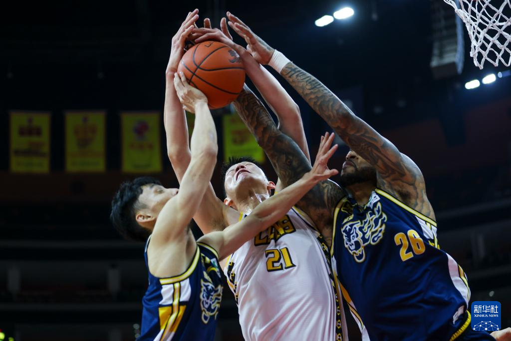 12月21日,浙江方兴渡队球员胡金秋(中)在比赛中争抢篮板球。