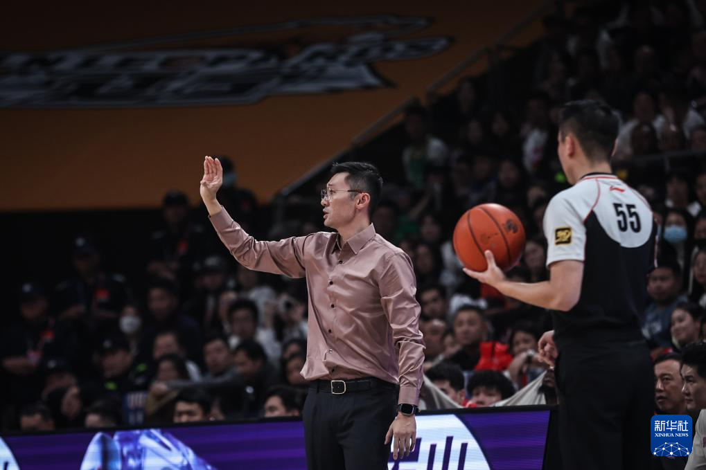12月28日,新疆伊力特队主教练刘炜(左)在场边指挥。新华社记者 潘昱龙 摄