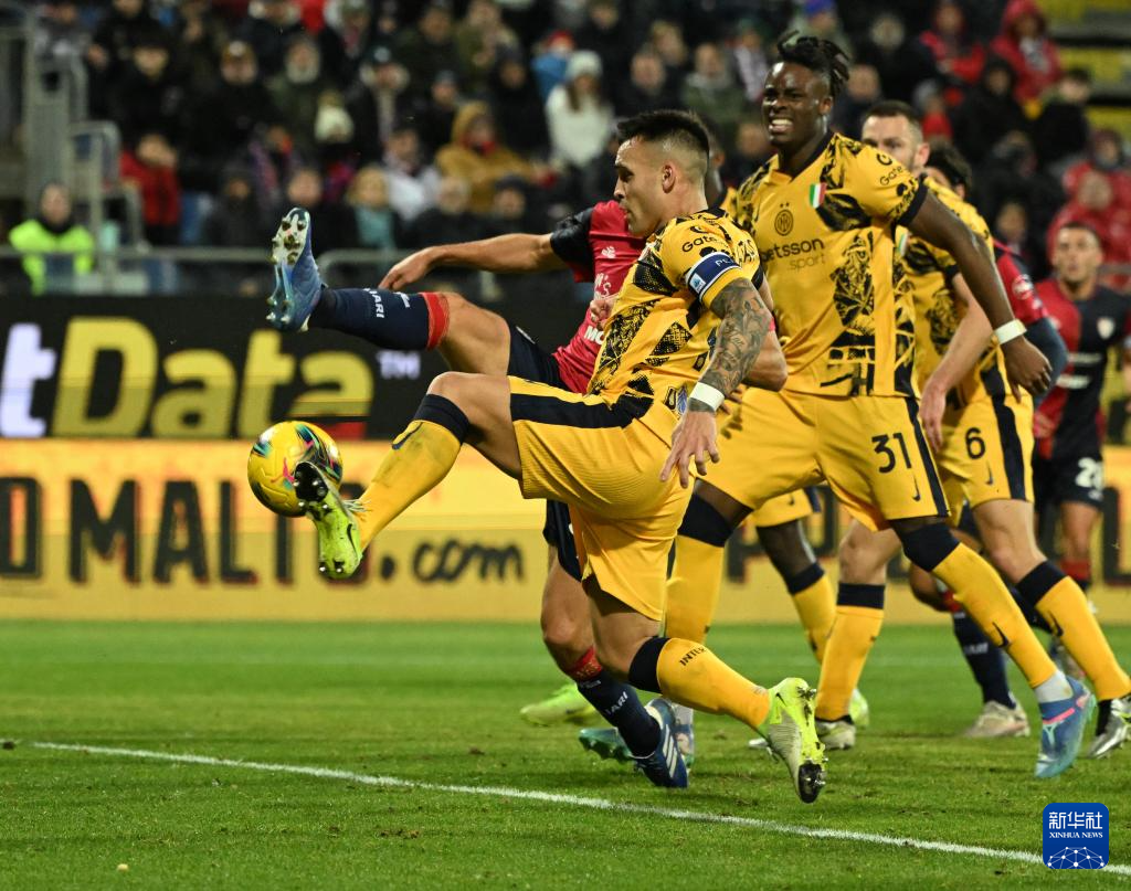 12月28日,国际米兰队球员劳塔罗·马丁内斯(右一)在比赛中射门得分。新华社发(迭戈摄)