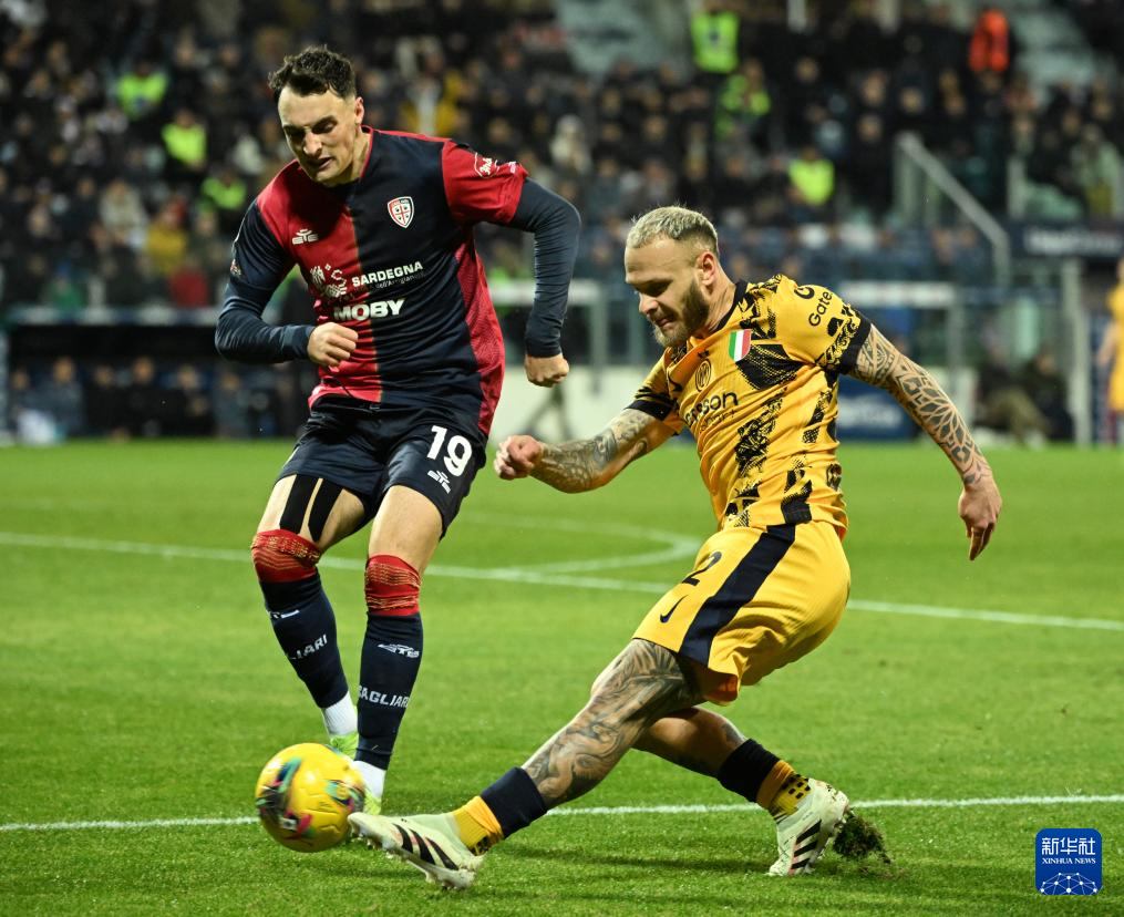 12月28日,国际米兰队球员迪马尔科(右)与卡利亚里队球员佐尔泰亚在比赛中拼抢。新华社发(迭戈摄)